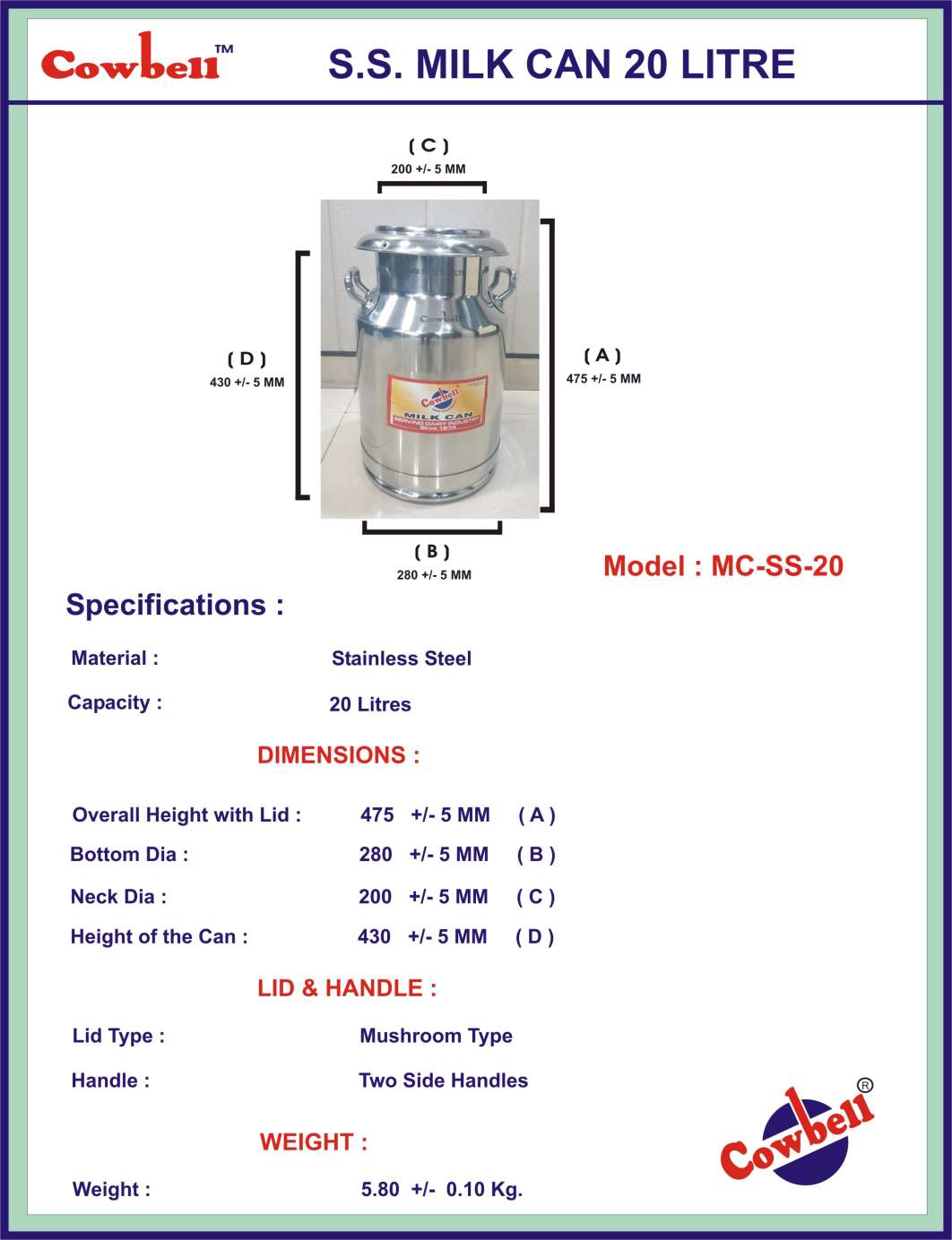 Stainless Steel Milk Can 20 Litre with Lid made from AISI 304 Grade Stainless Steel.
